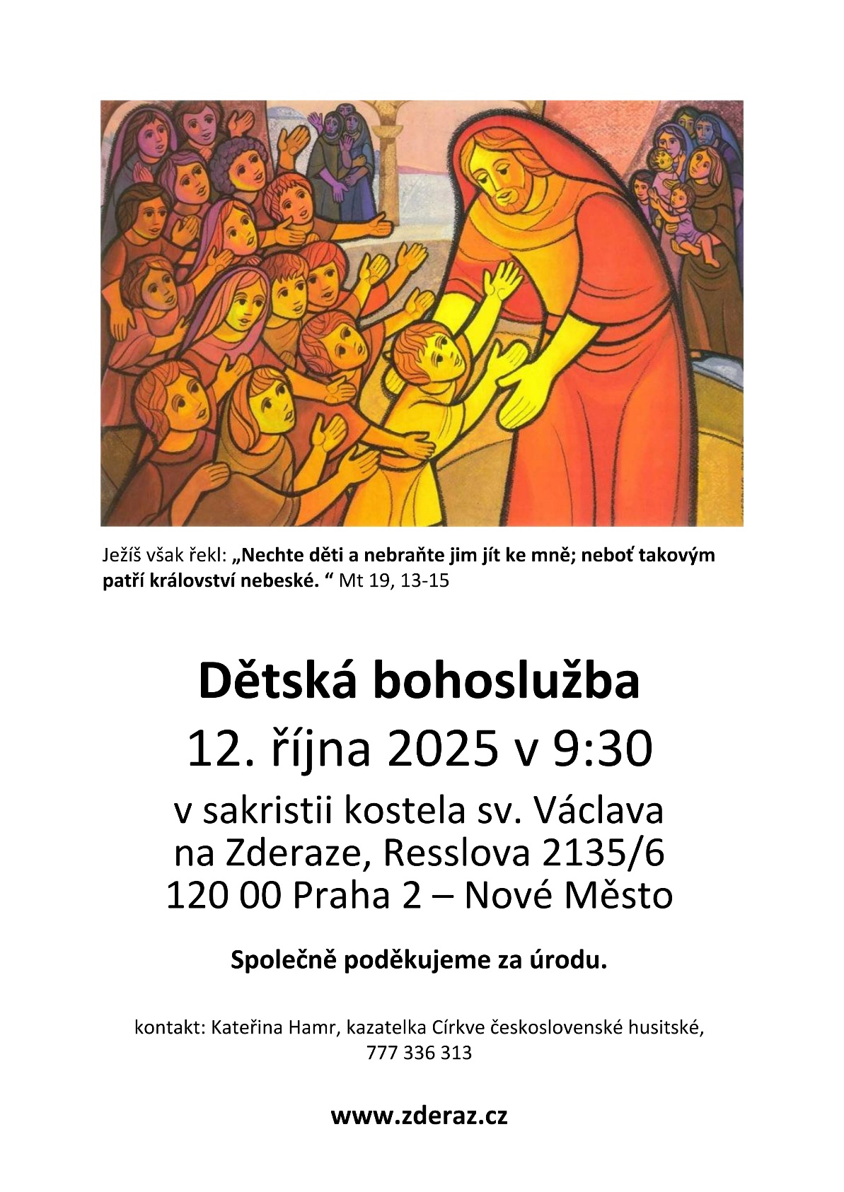 Dětská bohoslužba pod vedením sestry Kateřiny Hamr (zhruba jednou měsíčně - probíhá v sakristii paralelně s bohoslužbou dospělých v kostele.)